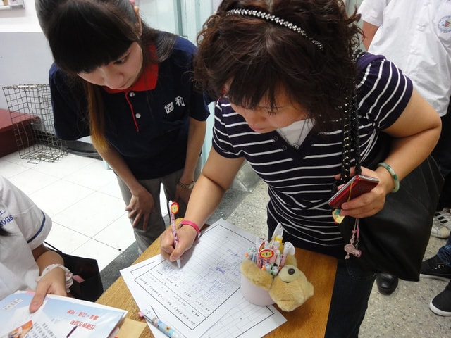 在簽名處,我們擺放可愛的熊熊筆筒,裝著可愛的結緣筆(一隻8~10元,購於師大夜市的金興發)
