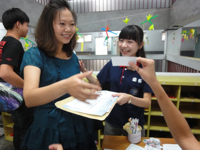 在家長會的尾聲,我們有請學生在門口發放結緣品