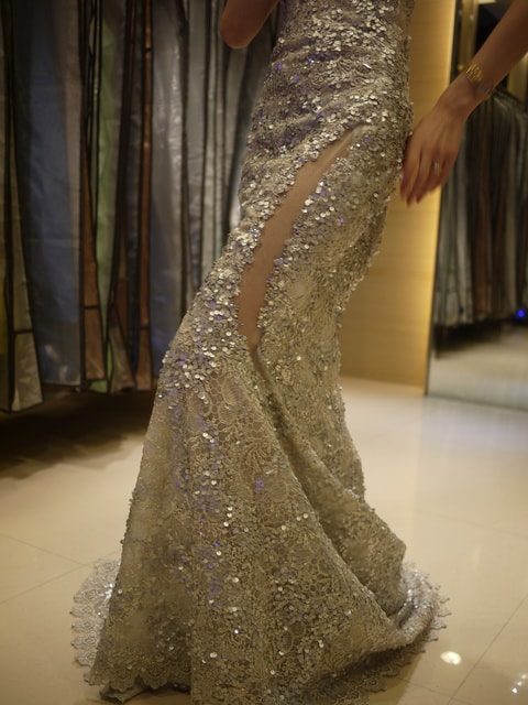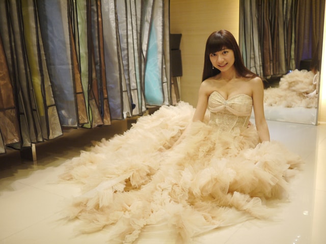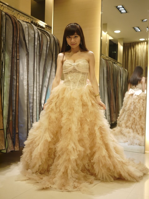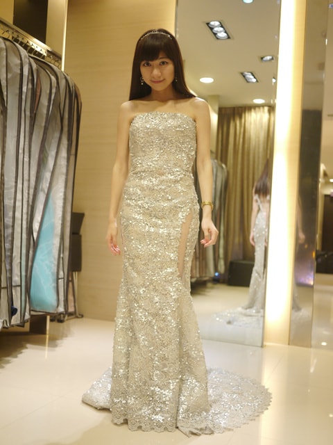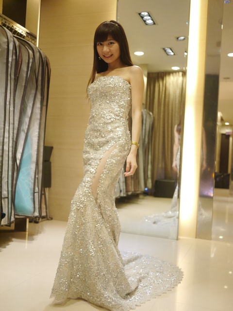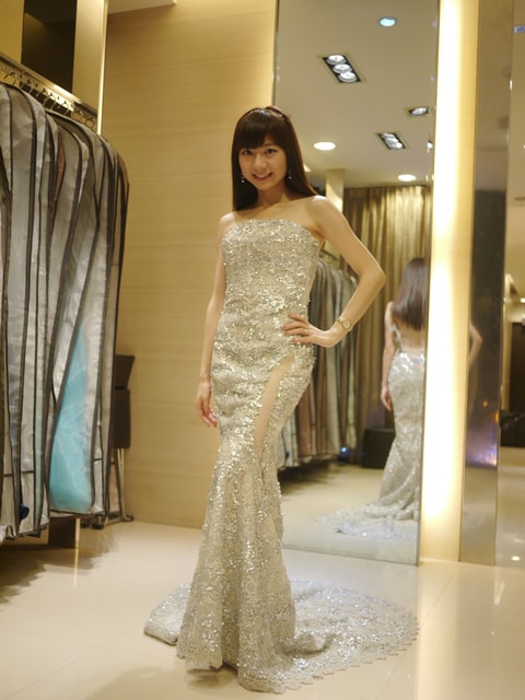 這款香檳色的大尾禮服我超愛,胸前還有bling bling 的水鑽