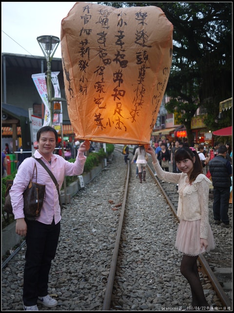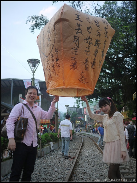 寫完後,把天燈帶到鐵路上攤開準備施放,店家也會四面幫我們拍好幾張![]()