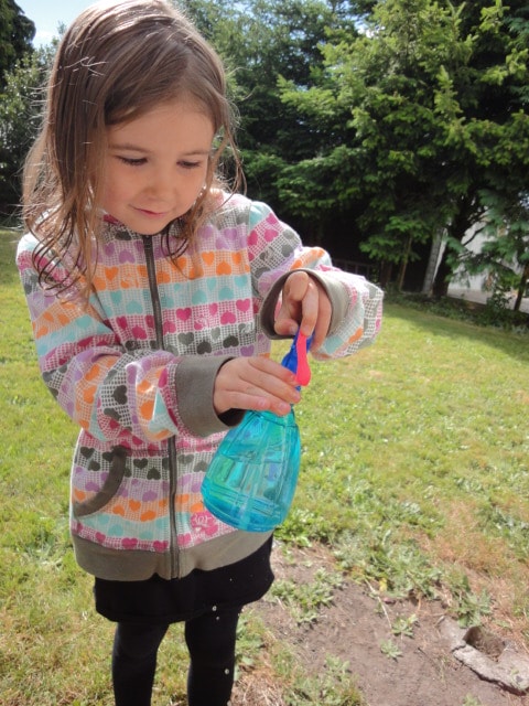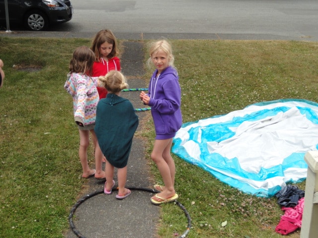 沒辦法,加拿大一堆大陸貨,連汽球也不例外,用水龍頭裝一直破,Erika索性用澆花器來裝水球?![]()