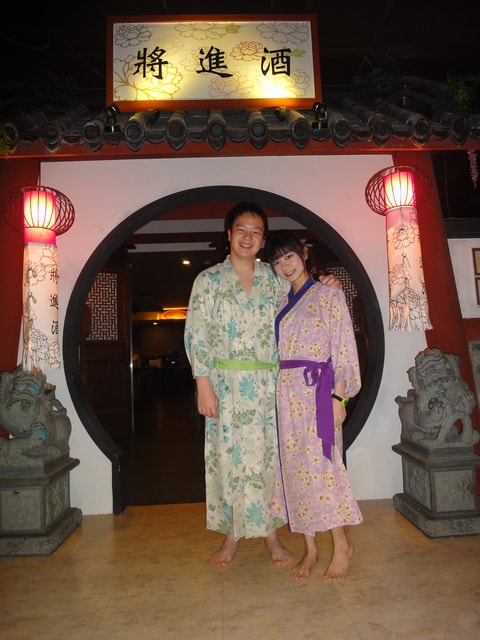 看, 【大紅燈籠高高掛】呢!! (燈籠明明就在身後啊!! 兩人還真愛演