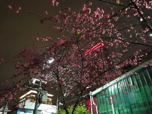 夜晚,步出威秀影城,在準備回家的途上,赫然發現路邊一株美麗的櫻花