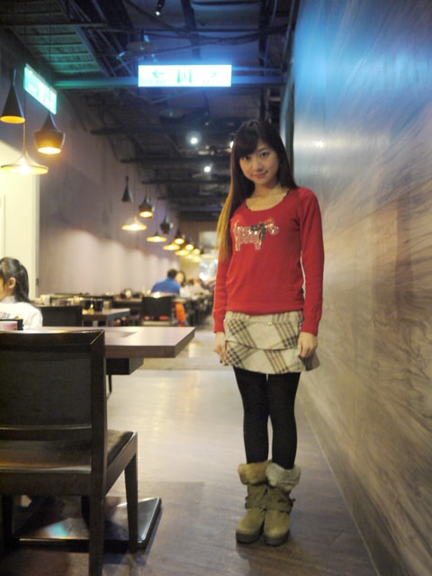 柔和的粉嫩毛衣,和紅色格紋SCOTTISH HOUSE的裙子好搭啊!!