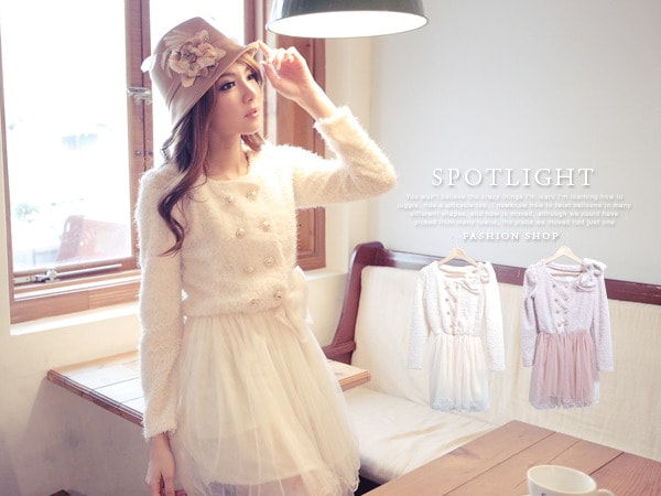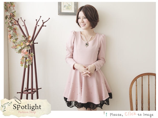 圓領公主袖珍珠點綴蕾絲裙襬洋裝 米白