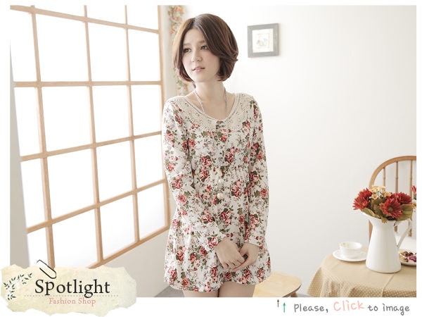 編織蕾絲領玫瑰圖案高腰棉質連身洋裝 價位260