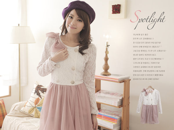 韓版圓領雙排釦蕾絲拼接粉紅紗網裙洋裝