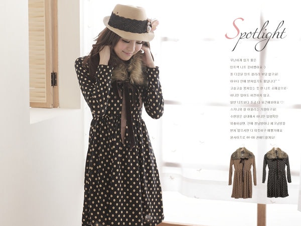 可拆毛領蝴蝶結傘狀下擺點點洋裝