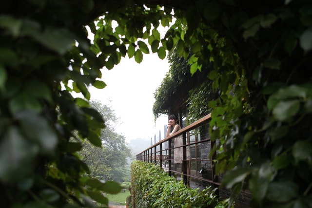 城堡的牆上綠油油的藤蔓纏繞 如夢似幻