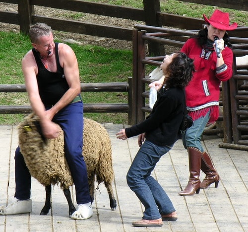 牛仔還有表演騎羊咩咩,雖然也有看到遊客騎著羊咩咩,馳騁在草原上感覺真好玩!