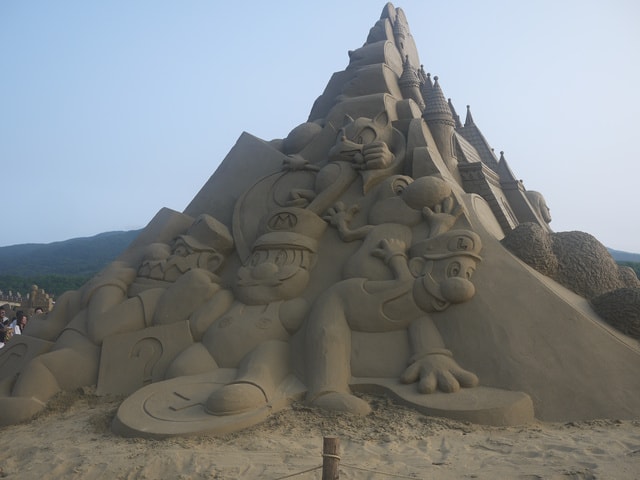 看這幾經大雨洗禮過後的沙雕,是否依然還是很吸睛呢 趁著6/30月底沙雕展結束之際,趕快來介紹一下2013台灣國際沙雕藝術節 現在,就來跟著我們一跳,來到福隆海水域場吧 ! (跳) 這天,我們計畫坐電車到福隆 我也帶了相當有夏天味的kitty藤編包 (換洗衣物丟給小杰就好啦) 高腰的牛仔短褲讓腿…