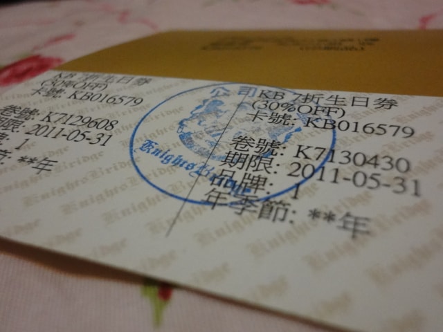 自四月份 就開始陸陸續續收到許多百貨專櫃的生日折價券 ex:KB. 金.安德森.狗狗牌.0918.aimer feel…從保養品.服飾到內衣(羞啦) 都在我涉獵的範圍內 但因為我最近實在是太乖 (什麼東西啊) 比較少跑百貨公司(是嗎)…