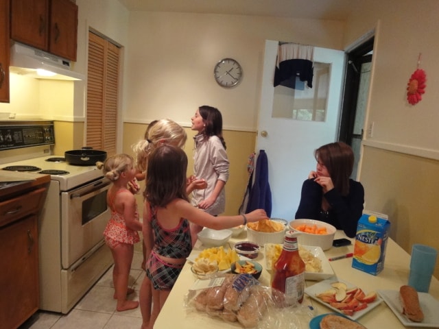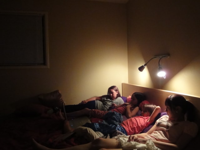 所倖就和孩子們在房間看著brides wars(新娘大作戰)